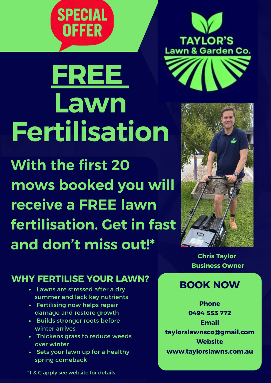 For the first 20 lawn mows booked we are offering a FREE LAWN FERTILISATION with your mow. The sun is out and the rain has come. Fertilising your lawn will promote growth and color to get your lawn back to its best from a long hot summer and get it to winter looking great. See ad below and click on the contact us below to book in your mow.